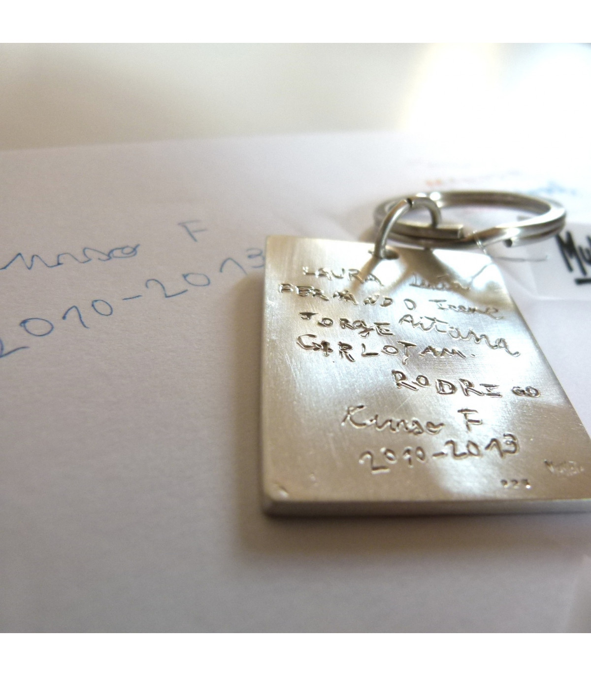 Llavero de plata 925 con tu dibujo personalizado, pieza única trabajada artesanalmente. Permite grabar dos dibujos, uno por cada cara. Un solo texto no se considera doble grabado por lo que, en ese caso, escoger el otro llavero que resulta más económico. Puede incluir 2 dibujos o hasta 24 nombres.