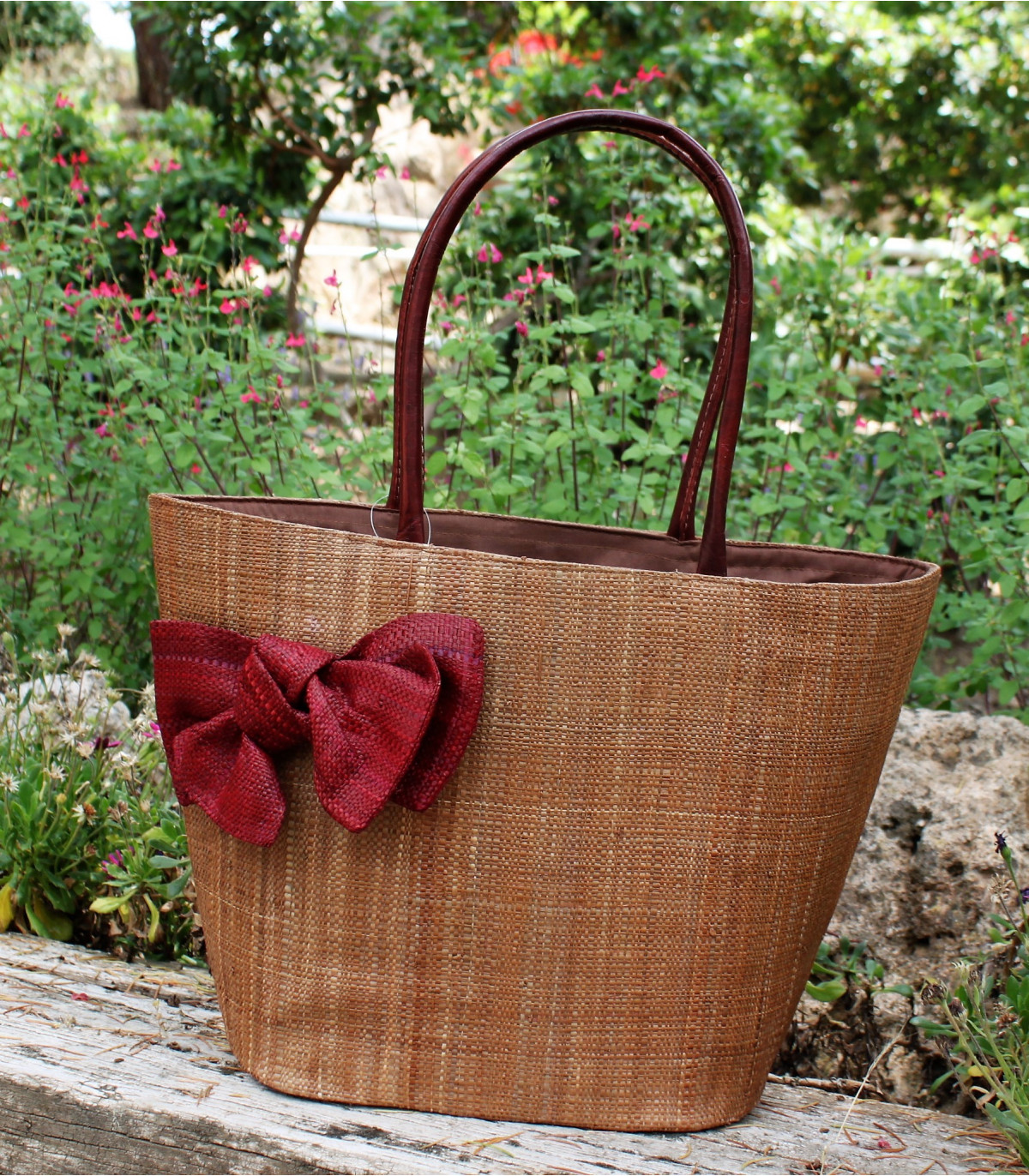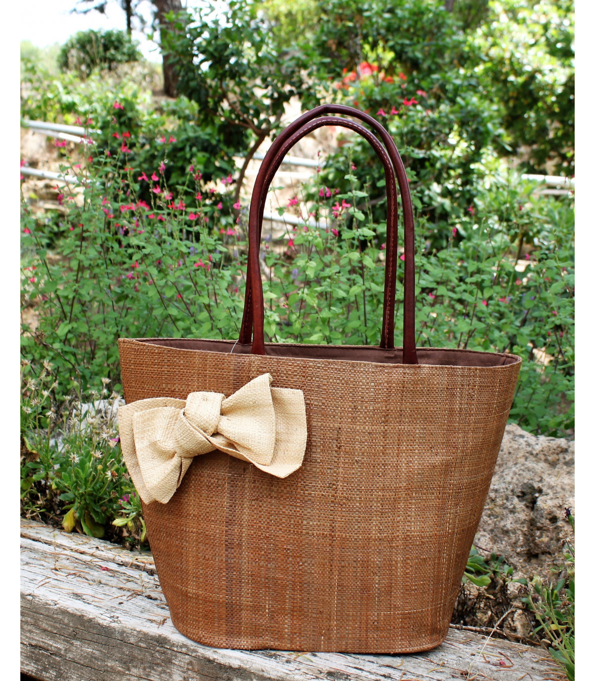 Bolso al hombro con asas de pie, forro interior con bolsiilos y cierre tipo fuelle. Forrado en su interior con tela a juego con el color de la rafia. Tiene cierre con tela y cordón, tirando de éste, el capazo queda totalmente cerrado y no se ve lo que hay en su interior. Estos bolsos son muy ligeros.
