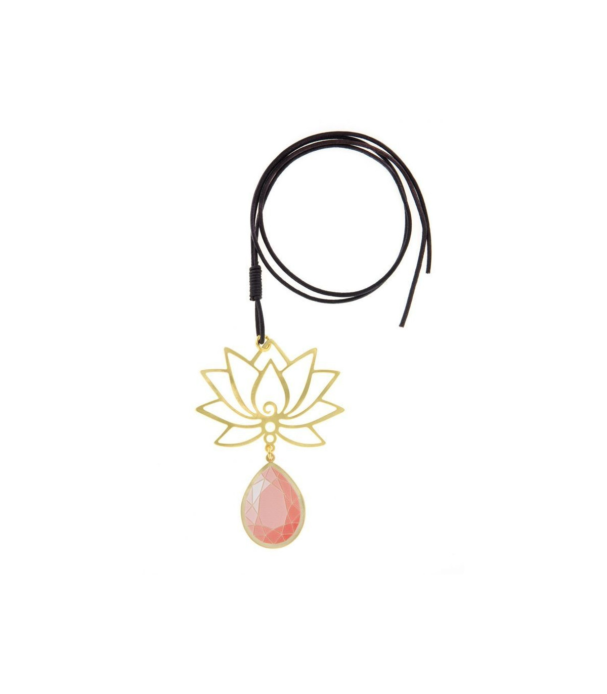 Colgante de la Colección flor de Loto, en esta ocasión con ambar. Formas elegantes con baño de oro que contrasta con el cordón de cuero regulable.