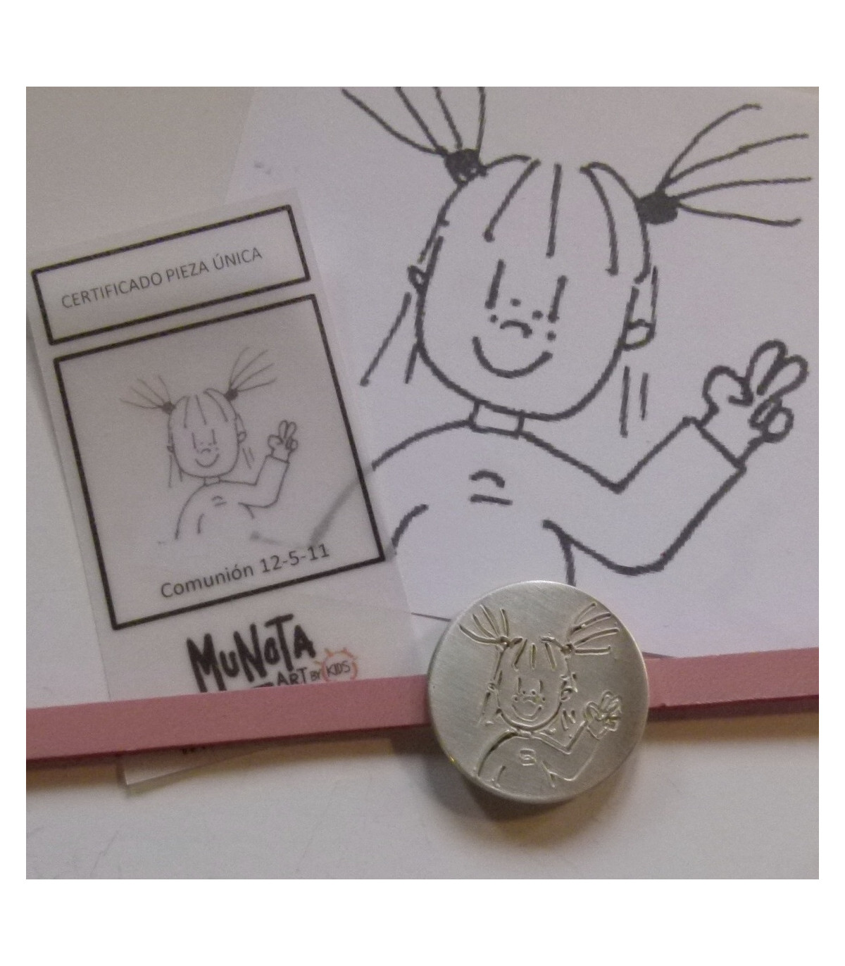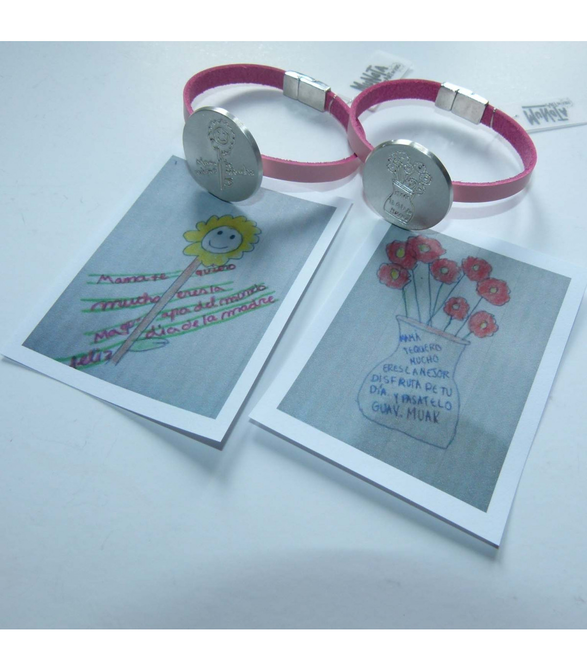 Pulsera infantil en plata 925 con tu dibujo personalizado, pieza única trabajada artesanalmente. Acabado en cuero de 6 mm de ancho y 2mm de grueso con cierre imantado. Grabado con el sello de autenticidad MUNOTA y plata 925. Permite grabar nombre o fecha en el interior.